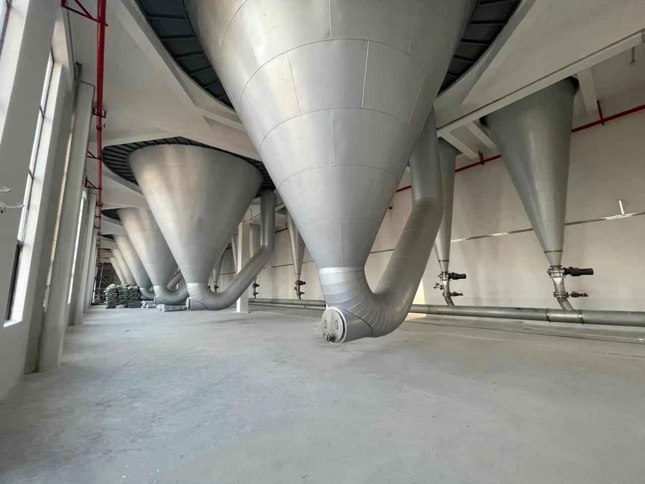 空氣通過(guò)加熱器轉(zhuǎn)化為熱空氣,進(jìn)入裝置在干燥室頂部的熱風(fēng)分配器,然后均勻的進(jìn)入干燥室,同時(shí)通過(guò)無(wú)級(jí)調(diào)速的螺桿泵將料液送至裝置在干燥室頂部的離心霧化器,使料液霧化成極小的霧化液滴,料液和熱空氣并流接觸,水份迅速蒸發(fā)在極短的時(shí)間內(nèi)干燥為成品,成品經(jīng)干燥塔底部和旋風(fēng)分離器排出,廢氣由風(fēng)機(jī)抽出排空。