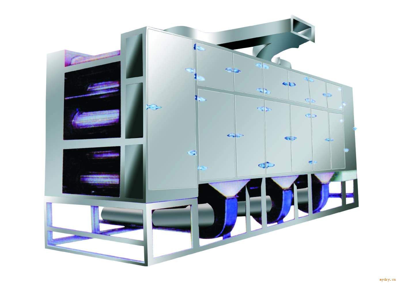 物料由加料器均勻地鋪在網(wǎng)帶上,網(wǎng)帶采用12-60目不銹鋼絲網(wǎng)。由傳動(dòng)裝置拖動(dòng)在干燥機(jī)內(nèi)移動(dòng)。干燥設(shè)備由若干單元組成,每一單元熱風(fēng)獨(dú)立循環(huán),部分尾氣由專門排濕風(fēng)機(jī)排出,廢氣由調(diào)節(jié)閥控制,熱氣由下往上或由上往下穿過鋪在網(wǎng)帶上的物料,加熱干燥并帶走水分。網(wǎng)帶緩慢移動(dòng),運(yùn)行速度可根據(jù)物料溫度自由調(diào)節(jié),干燥后的成品連續(xù)落入收料器中。上下循環(huán)單元根據(jù)用戶需要可靈活配備,單元數(shù)量可根據(jù)需要選取。